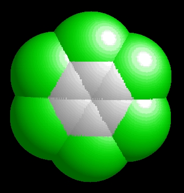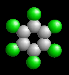 A hexaklórbenzol molekulaképe balra golyó és pálcika jobbra térkitöltéses megjelenítésben.